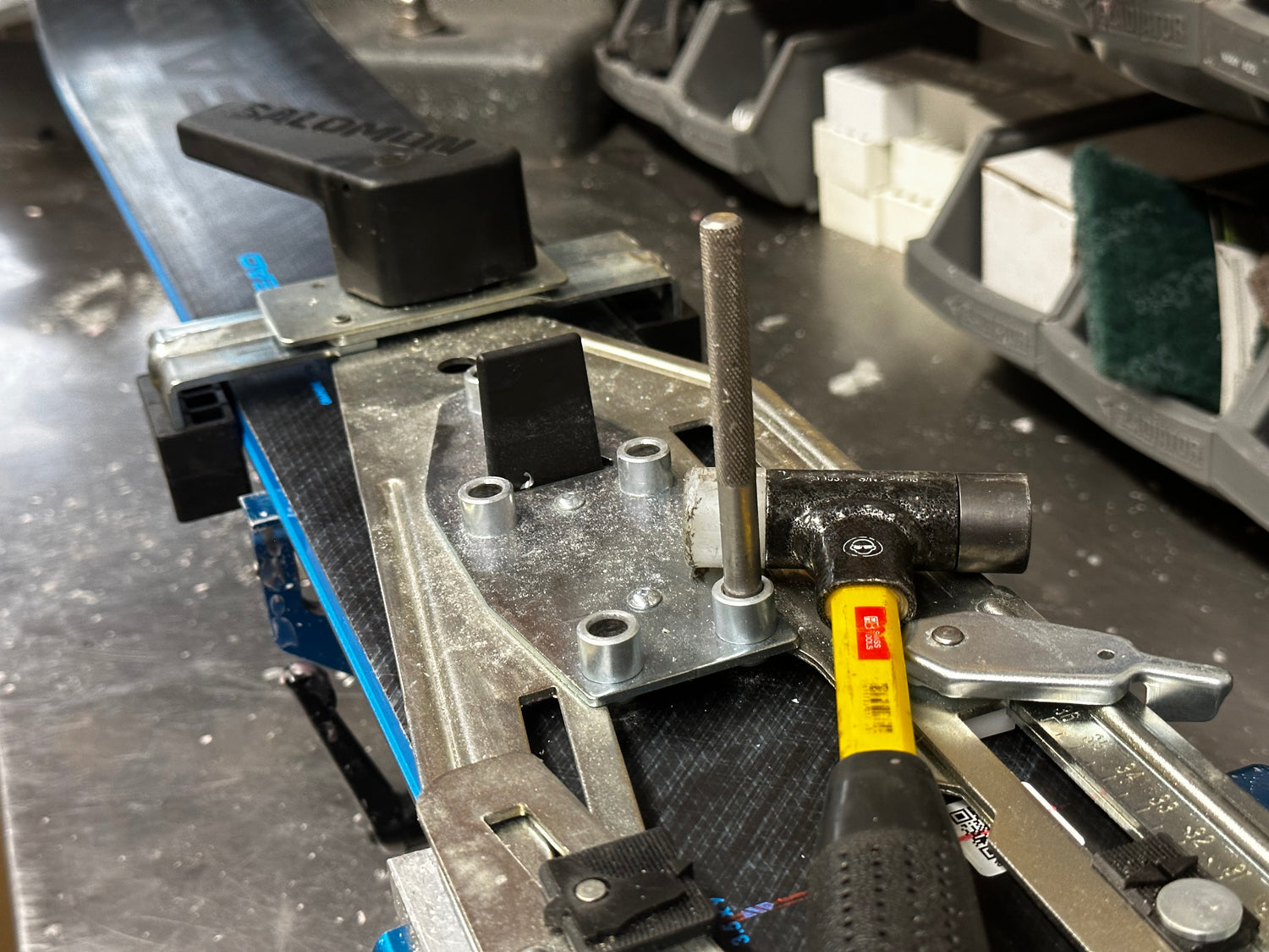 We use dedicated alpine center punches to index holes through the factory jig, ensuring each screw hole is perfectly centered. This also lets usprecisely verify binding-hole compatibilityduring remounts—checking patterns before drilling to maintainsafe distancesfrom existing holes and ensure a clean, reliable mount.