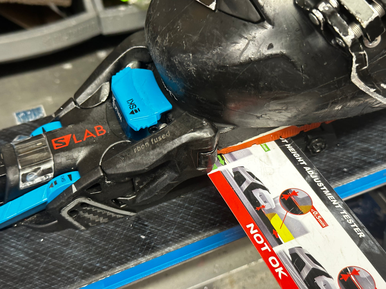 We set forward pressure precisely to the manufacturer’s spec for each binding model. For touring/pin bindings, we also use dedicated forward-pressure gauges for every model to verify exact settings.